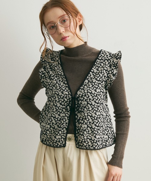 【目を惹く花柄生地が華やかなフリルデザイントップス】・ふんわり軽やかなポリエステルの花柄生地を使用したトップス・フロントのリボンデザインとクルーネックの前後2way仕様・肩にはひらっとフリルでボリュームを出し、肩のラインを華奢見せ・ナチュラルなコットンレースで縁取った華やかさもポイント○・同生地シリーズのスカートと合わせてセットアップで着用するのもおすすめ~スタイリング~いつものコーデにプラスワンするだけで大人ナチュラルなスタイリングが叶う1枚。リブトップスやハイネックニット、ワンピース等、シンプルなアイテムと相性良く着ていただけます。ボトムスには同シリーズのスカートとセットアップでの着こなしはもちろん、ゆとりのあるデニムとカジュアルに着るのもおすすめです。- - - - - - - - - - - - - - - - - - - - - - - - - - - - - - - - -透け感:なし厚さ:薄手裏地:なし伸縮性:なし光沢感:なし仕様:前リボン開き洗濯: 自宅洗濯可能(ネット使用推奨)- - - - - - - - - - - - - - - - - - - - - - - - - - - - - - - - -●シリーズ展開もご用意してあります。フラワーギャザースカート[c2R3701]※着用、お取り扱いの際は、商品についている品質表示とアテンションタグを必ずご確認下さい。花柄/セットアップ対応可/オールシーズン/大人ナチュラル