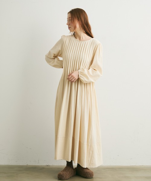【上品なタックデザインがポイントの女性らしいフレアワンピース】・コットンの軽やかな素材が着心地の良いワンピース・クルーネックですっきりとした印象に・衿元から胸元までぐるっと1周タックが入っており、裾に向かってフレアが広がる上品シルエット・袖に入ったギャザーもやわらかい粉息を演出~スタイリング~さらっと1枚での着こなしはもちろん、、ベストやカーディガンを合わせたスタイリングもおすすめです。冬はハイネックインナーを首元から覗かせるのも◎ナチュラルな素材感ながらも落ち感のあるシルエットで大人っぽくキマる1枚。- - - - - - - - - - - - - - - - - - - - - - - - - - - - - - - - -透け感:なし厚さ:薄手裏地:なし伸縮性:なし光沢感:なしポケット:なし仕様:後ろボタン開き洗濯: 自宅洗濯可能(ネット使用推奨)- - - - - - - - - - - - - - - - - - - - - - - - - - - - - - - - -※着用、お取り扱いの際は、商品についている品質表示とアテンションタグを必ずご確認下さい。シンプル/ロングワンピース/単色/淡色/きれいめ/大人ナチュラル