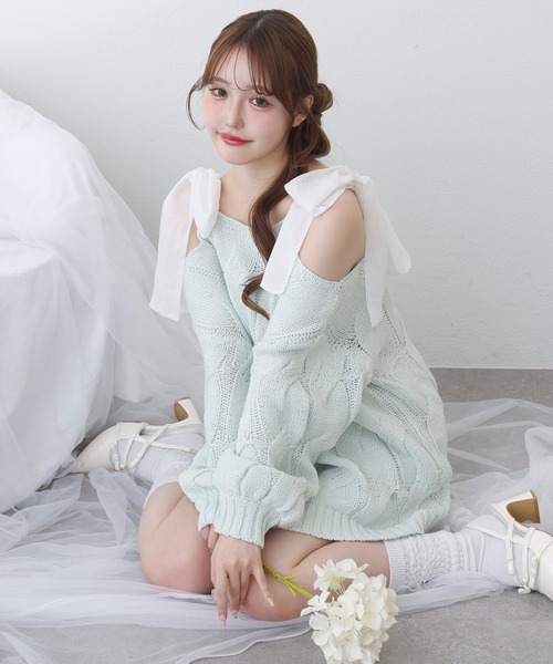 ~NICECLAUP 2026 Spring Collection~ケーブル編みが可愛い、肩あきデザインのニットミニワンピース。程よく肌見せできる肩あき仕様に、シアーリボンをあしらって女性らしさをプラス。立体感のあるケーブル編みで、1枚で着映えするデザインに仕上げました。ニット素材で着心地も良く、大人かわいいスタイルが1枚で完成する、主役級ワンピースです。■オススメスタイリングロングブーツと合わせてトレンド感のあるコーデにショート丈アウターを羽織ってバランスよく着こなすのもおすすめ。------------------裏地:なし伸縮性:あり生地の厚さ:普通生地の重さ:普通洗濯:非常に弱い家庭用洗濯/ウエットクリーニング------------------【ニットアイテムのお取り扱いのご注意】※ニットアイテムは、素材特性上以下の点にご注意下さい。●この製品は素材の特性上、着用やクリーニングにより、毛羽立ちや毛玉が発生することがあります。1、1日着用した際は、2.3日休ませるなどしてご使用ください。2、毛玉が出来てしまった場合は、毛玉取り器、又はハサミで丁寧にカットして取り除いてください。●この製品はデザイン性、風合いを重視し編みたてたニット製品です。着用により若干の伸びが生じますのでご了承お願いします。又、保存時のハンガーのご使用は避け下さい※サンプルでの撮影のため、実際のものと仕様や色が異なる場合があります。※室内、室外での撮影のため実際より明るく映っていたり、暗く映っていたりする場合がございます。※品質表示を必ずご確認下さい。【商品のお気に入り登録】完売カラーの再入荷や、ラスト1点のお知らせ、セールの通知を受け取ることができます。【ブランドのお気に入り登録】新作入荷や再入荷情報など、ブランドの情報をいち早くお届けします。ぜひご登録ください♪2026SS