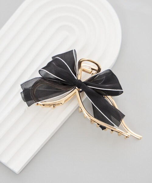 【デザイン・シルエット】 ・透け感のあるオーガンジーリボンと、艶感のあるメタル素材を組み合わせたヘアバンス。 ・立体的なリボンデザインが、後ろ姿に華やかさをプラス。 ・甘さのあるリボンとシャープなメタルラインのバランスで、大人っぽく仕上げたデザイン。 ・程よいサイズ感で、まとめ髪をしっかりホールドしやすい。 【カラー】 ・ブラック、ライトグレーの2色展開。 【スタイリングポイント】 ・ワンピースやブラウスに合わせて、フェミニンなスタイルのアクセントに。 ・きれいめコーデやシャツスタイル、セレモニーシーンのヘアアレンジにもおすすめ。 ・ハーフアップや低めシニヨンなど、幅広いアレンジに活躍。 ※撮影時の光、お使いのモニター環境によって色の見え方が違う場合がございます。