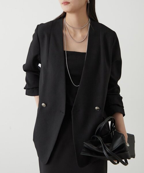 すっきりとしたノーカラーデザインが、洗練された麻調合繊ノーカラージャケット■デザインさらりとした着心地で、これからの季節に活躍するノーカラージャケット。フロントはダブルボタンで、程よいきちんと感をプラス。■コーディネート麻のようなナチュラルな風合いながら、扱いやすい合繊素材を使用しているため、デイリーユースに最適です。袖をロールアップして、こなれた雰囲気を演出できます。オフィススタイルにはもちろん、カジュアルな着こなしにもマッチします。インナーにタンクトップやTシャツを合わせて、ラフな着こなしに。デニムと合わせてカジュアルダウン、ワンピースと合わせてフェミニンに、様々なスタイリングをお楽しみいただけます。■素材・洗濯表記本体 レーヨン 56%,ポリエステル 44%別布 ポリエステル 100% 手洗い可【お気に入り登録でお得な情報をお知らせいたします 】完売カラーの再入荷やラスト1点の通知、セールの通知を受けとることができます。【ブランドのお気に入り登録】新商品や再入荷、いち早くセールやクーポンなどのブランドの情報を受けとることができます。生産の都合上、お届け時期が前後する場合がございます。システムの都合上、店舗より入荷が遅れる場合がございます。実際にお届けする商品と仕様やサイズが異なる場合がございます。照明や光の当たり具合で色味が違って見える場合があります。