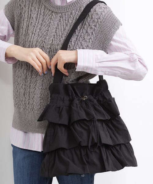 【デザイン】 ティアードとドロストがポイントの撥水加工素材のショルダーバッグ。 ナイロン素材で抜け感があり、かわいくなりすぎない大人フェミニンショルダー。 口元はマグネット付きで安心。 カジュアルからキレイめまで幅広いテイストに合わせやすいです。 長さ調節が可能なショルダーストラップで、肩掛けでも斜め掛けでもスタイリングできます。 軽量なので、デイリーから旅行まで活躍します。 【仕様】 ・ポケット数:内側×3 ※照明の関係により、実際よりも色味が違って見える場合があります。また、パソコン・スマートフォンなどの環境により、若干製品と画像のカラーが異なる場合もございます。 店舗へのお問い合わせ商品番号:769-05033 ●製品寸法: 00:高さ35cm 幅(上部)~34.5cm 幅(下部)28cm マチ13cm ショルダー対応サイズ60~118cm 備考:重量:約345g(サンプルサイズ)