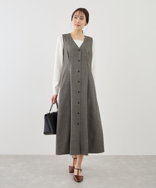 【素材感】 ・ポリエステル主体でシワになりにくく、扱いやすい素材感。 ・薄手のツイード生地で軽やかさと季節感を両立。 【デザイン・シルエット】 ・ウエストタックが立体感を演出し、すっきり見えを実現。 ・Vネックデザインで顔まわりをすっきり見せ、インナーとのレイヤードも楽しめる仕様。 ・両サイドには便利なポケット付きで、実用性も◎ ・ほどよく広がるAラインシルエットが、体のラインを拾わず自然にカバー。 ・ボタンベルトでウエスト位置を調整し、好みのシルエットに。 ※ボタン位置は片方で3cm、両方で6cm調整可能。 ※詳細画像の14〜17枚目は内側のボタンで止めています。 【カラー】 ・グレー系(09)、ベージュ系(29)は杢調で奥行きのあるニュアンスカラー。 ・ネイビー(40)はシンプルな無地で幅広いスタイリングに対応。 ・落ち着きのある色展開でオンオフ問わず着回し可能。 【スタイリングポイント】 ・シアーロンTやボートネックインナーとのレイヤードがおすすめ。 ・ジャケットを羽織ったり、インにシャツやブラウスを合わせればきれいめコーデにも対応。 ・ブーツやパンプスで季節感をプラスし、上品な印象に。 【同シリーズアイテム】 ・ウエストタックジャンパースカート/低身長・小柄さんサイズ(品番:GDE16030) ※着丈差4.5cm 【前シーズンのウエストタックジャンパースカート(品番:GDE55100)をアップデート】 ・よりスタイルアップが叶うようにタックの位置を調整。 ・組成を一部変更しております。 旧品番 ポリエステル 100% 新品番 ポリエステル 98% ポリウレタン 2% ----------------------------- 裏地:なし 光沢感:なし 透け感:なし 伸縮性:ややあり ウエスト:ゴムなし ファスナー:なし ポケット:あり ボタン:あり(開閉可) 生地の厚さ:普通 その他仕様:ウエストにサイズ調整のボタンあり2段階 季節:春、秋 ----------------------------- ※撮影時の光、お使いのモニター環境によって色の見え方が違う場合がございます。 ※2025年秋冬商品より、ワンサイズ展開の商品は「F(フリーサイズ)」表記に変更しております。 詳しい採寸はサイズ欄をご覧ください。 【モデル着用サイズ】 身長:165cm 着用サイズ:F 【2026 Spring】【26SS】