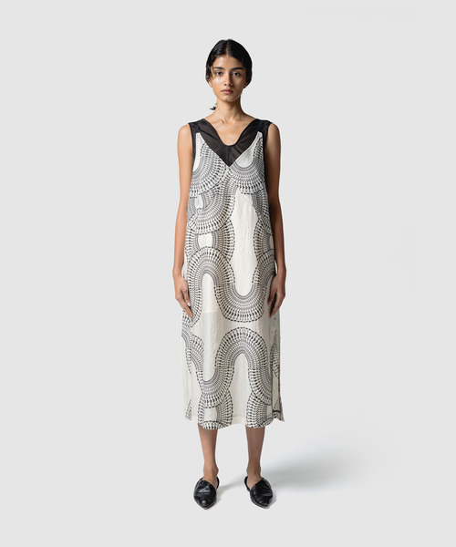 ※2/2(月)19:00までの期間限定予約販売とさせていただきます。※上記期間中でも限定数に達し次第終了とさせていただきます。※予約のみの販売となり通常販売予定の無いお品物もございますので予めご了承ください。柄とシアー素材のコンビネーションが都会的な雰囲気を演出するドレス。ーデザインについて・キャミドレスにシアーノースリーブを重ねたようなレイヤードデザインが特徴・大胆な幾何学模様のプリントがモダンで洗練された印象を演出・背中のボタンディテールがアクセントにースタイリングについて・異素材の組み合わせが映える一枚で、単体での着用がおすすめ・ジャケットやカーディガンを羽織れば、フォーマルなシーンにも対応■素材の特徴・環境に配慮したサステナブルなアセテート素材を使用・絹のような美しい光沢と発色性・しなやかで上品な風合い・接触冷感でひんやり快適・速乾性に優れ、いつでもさらりとした着心地■素材の質感透け感:あり(インナー部分)裏 地:なし伸縮性:なし光沢感:あり生地の厚さ:薄いポケット:なしその他:肩紐ゴム仕様【muller of yoshiokubo】Dress For Daily Life 〜ドレスを着るという楽しみを日常に〜「muller」は、スペイン・アラゴン州でつかわれる方言で“女”を意味する言葉。この言葉を冠することで、ローカルでマイナーなものが常に新しさと驚きを運んできてくれる、という確信をブランド名に込めています。「女性が着る洋服とは?」を追求した先に見出したのが、女性だけのファッションであるドレス。これをブランドの象徴に、「いつの時代でも、どんなに時間が経っても、身につけることで喜びや心躍る気持ちになれる一着を」と、ドレスだけでなく、トップスやスカート、パンツという形で提案しています。【お買い物をよりお楽しみいただく為に】▼商品のお気に入り登録(♡マークをクリック)完売カラーの再入荷や、ラスト1点の通知を受ける事ができます。▼ブランドのお気に入り登録新商品や再入荷など、いち早くブランドのお得な情報を受け取ることができます。