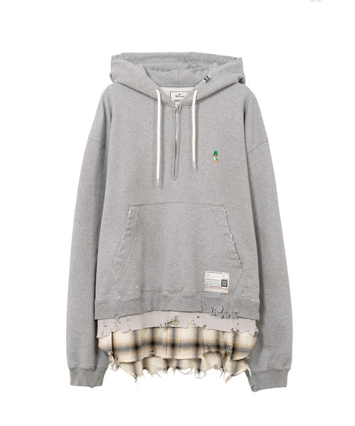 【2025 Autumn/Winter Collection】 トリプル レイヤード ハーフジップ フーディー 3枚のトップスを重ね着したような構築的デザインのハーフジップフーディー 左胸にレオンの刺繍をデザイン。 ハーフジップ。 フロントポケット。 *全体に見られる穴あきダメージはデザインの一部です。 着用モデル : 182cm 着用サイズ : 48 ※商品画像は光の加減やモニター環境により、実際の色味と異なる場合がございます。 ※掲載写真はサンプル品のため、加工やサイズ感に多少の違いが生じる場合がございます。 ※生産時期や個体差により、色味・素材感・仕様にわずかな変化が見られる場合がございます。あらかじめご了承ください。 ※全体に施された穴あきやダメージ、汚し加工は、製品の特性としてデザインに取り入れられたものです。風合いとしてお楽しみください。