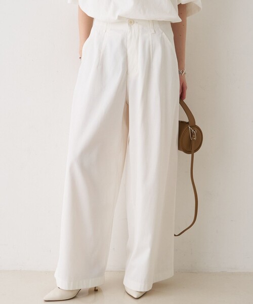 撥水加工を備えたキレイめワイドパンツ。サステナブルな原料を使用し、よりハイエンドな風合いを目指して強い撚糸をプラス。程よいドレープ性と滑らかで美しい表面感を実現したポリコットン素材に、さらに撥水加工を施した機能派ワイドパンツです。カジュアルなディテール(腰履き風のウエスト見返し仕様など)を、きれいめな素材感で仕上げることで絶妙なアンバランスさを追求。日常使いはもちろん、アウトドア感のある突然の小雨や汚れが気になるシーンでも安心して着用いただけます。クリーンに見せたい日:白シャツ+ポインテッドトゥでシャープにまとめて、オフィスカジュアルにも。カジュアルダウン:ボリュームスニーカー+オーバーサイズTで旬のスポーティミックスに。上品な抜け感:肩を抜いたジャケットやローファーでメンズライクな着こなしに。アウトドア風の実用スタイル:撥水トップスや薄手コートと合わせて、雨の日もスマートに。【注意事項】※商品画像は、光の当たり具合やパソコンなどの閲覧環境により、実際の色味と異なって見える場合がございます。あらかじめご了承ください。※画像の商品はサンプルです。実際の商品と仕様、加工が若干異なる場合があります。※サイズ表記はあくまで目安となります。※その他の予約商品、通常商品との同時決済はできません。※入荷状況により、お届け予定が前後する場合があります。※お客様への発送が店頭販売より遅れる場合もあります。※追加生産商品は、一部の店舗、通販で販売中の場合がございます。予めご了承下さい。※商品を使用前に、タグ等に記載されている「取り扱い上の注意書き」「洗濯表示」を必ずご確認ください。※商品に不良が無い場合、包装紙および箱の彼損がございましても発送いたします。あらかじめご了承ください。