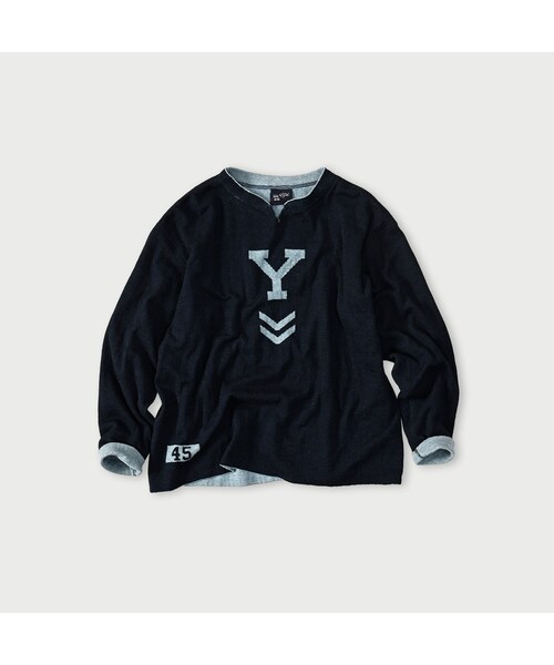 ニットdeTシャツTシャツの着やすさにニットの心地よさを合わせて毎日着たくなるニットソーをつくりました。インディゴで深く染めた太さの違う糸を使って空気を一緒に編みこんだ凸凹が可愛くて柔らかい肌触りです。私たちのSDLは、作り手の温度を伝え顔が見えるものづくりが持ち味。SDLネームがその証です。裏とおもてで違った顔になるリバーシブルカラーのニットです。ヴィンテージをお手本にしたスキッパーの襟や布パッチのようなロゴがアクセント。ユニセックスで着用いただけます。ものづくりページはこちら