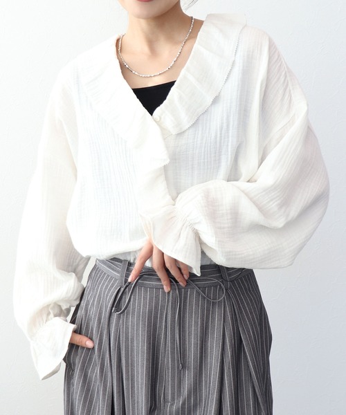 ダブルガーゼフリルブラウスふんわりと空気を含んだダブルガーゼ素材が、ナチュラルで優しい表情を演出する一枚。フロントに流れるように施したフリルが女性らしさを引き立てつつ、Vネックデザインで甘さを程よく引き算した大人のためのブラウスです。身体のラインを拾いにくいゆとりのあるシルエットはデニムやワイドパンツと合わせたカジュアルスタイルから、きれいめボトムとの上品な着こなしまで幅広く対応。一枚で主役になる存在感がありながら、レイヤードもしやすく、季節をまたいで活躍してくれるアイテムです。■Point・肌当たりの良いコットンダブルガーゼ素材・縦ラインを強調するフロントフリルデザイン・デコルテを美しく見せるVネック仕様・袖口フリルでさりげないフェミニンさをプラス--------------------------------------透け感:色によりあり裏地:なし伸縮性:なしケア方法:手洗い可※お洗濯の際は洗濯表示を必ずご確認ください。--------------------------------------