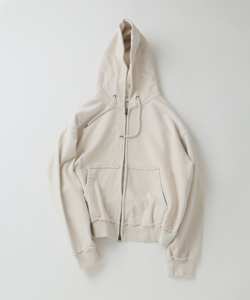 ROUGH CUT SWEAT ZIP PKピグメント染め×ハンド加工で仕上げた、春の羽織りとして最適なこだわり満載のZIPパーカーが登場。好評頂いている「ラフカット クルーネックスウェット(品番:26070464000010)」と同シリーズのジップパーカーが完成しました。■職人の手仕事を感じる「3段階加工」ピグメント染め: まず生地の段階で顔料染めを行い、独特の色ムラを表現。フェード加工: 製品洗いによる色落としで、長年着込んだようなフェード感(色あせ)をプラス。コスリ加工: 仕上げに部分的に手作業を入れることで、機械だけでは出せないリアルなヴィンテージの雰囲気を演出しました。■使い勝手の良い360g裏毛スウェット厚すぎず薄すぎない、標準的な「360g」のレギュラー裏毛を使用。ヘビーウェイトのような乾きにくさがなく、ペラペラでもない安心感のある肉厚さ。春・秋のアウターとしてはもちろん、冬のコートのインナーとしてもゴワつかずに使える、年間を通して一番出番の多い「ちょうどいい」厚みです。■こだわりのディテール切りっぱなしのリブデザインや、アクセントになる「太めのロープスピンドル」が特徴。存在感のある太いロープ紐が、全体のラフな印象を引き締め、古着のエッセンスを感じさせます。■トレンドの「BOXシルエット」身幅はたっぷりと取りつつ、着丈を短めに設定したややオーバーサイズのボックスシルエット。ワイドパンツと合わせた際に脚が長く見える絶妙なバランスで、フロントのダブルジップを開閉することでレイヤードスタイルも自在に楽しめます。カラーは、製品染めによるスモーキーなパステルカラー。大人がデイリーに着やすい、今の気分にフィットする「サイズ感」と「ディテール」にとことんこだわった春色スウェットパーカーです。他の「ラフカット スウェット」シリーズもおすすめです!品番:26070464000010商品名:ラフカット クルーネックスウェット**********************裏地:なし(裏毛)伸縮性:ややあり光沢感:なし生地の厚さ:普通**********************【スタッフ着用コメント】《スタッフH》身長:173cm/体重:62kg/体型:中肉中背/普段サイズ:M/着用サイズ:Mサイズ感:身幅広め、着丈すっきりのシルエットです。素材感:厚すぎず、薄すぎずでオールシーズン使いやすい素材感です。着心地:軽量で計算されたシルエットと気分も上がるカラーリングです。**********************《画像についてのご注意》※照明の関係により、実際よりも色味が違って見える場合があります。またパソコン・スマートフォンなどの環境により、若干製品と画像のカラーが異なる場合もございます。※商品の色味は、商品アップ画像をご参照ください。《商品のお気に入り登録について》「カートに入れる」または「予約する」右側のハートマークを押していただくと、再入荷、残り1点、セールなどの通知を受け取ることが出来ます。本体:洗濯機洗い(弱)