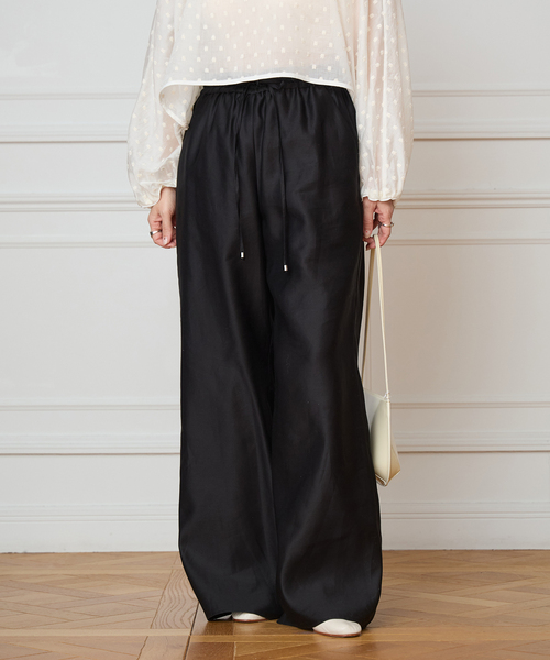 【2026SS】 IENA LA BOUCLE 定番人気のイージーパンツがコットン素材で新登場! この春はツヤのあるコットンサテン素材を採用。 軽くて柔らかくしなやかな生地なので、穿いた瞬間からストレスのない心地よさが魅力。 上品な光沢のおかげで、リラックス感がありながらもきれいめに見えるのがポイント。 裾に向かってほどよく広がるAラインシルエットは、脚をまっすぐ長く見せてくれると人気のデザイン。 すっきりとした見た目とゆったり感のバランスが絶妙で、定番として長く愛されているシルエットです。 デイリー使いにはもちろん旅先にも連れていきたい、楽なのにちゃんと見える万能パンツです。 ※シリーズ コットンサテンシャツ(品番 26050914123010) ********************** 透け感:なし 裏地:なし 伸縮性:なし 光沢感:あり 生地の厚さ:普通 ********************** ※取り扱いについては、商品についている品質表示でご確認ください。 ※こちらの商品は、IENA LA BOUCLE(NEWoMan新宿店)でのお取扱いとなります。 直接店舗へお問い合わせの際は、上記店舗へお願い致します。 ※照明の関係により、実際よりも色味が違って見える場合があります。 またパソコン・スマートフォンなどの環境により、若干製品と画像のカラーが異なる場合もございます。 ※商品の色味は、商品アップ画像をご参照ください。 ブラック・ブラウン着用スタッフ身長:156cm 着用サイズ:38 ベージュ着用スタッフ身長:160cm 着用サイズ:38 詳細着用スタッフ身長:162cm 着用サイズ:38 本体:洗濯機洗い(弱)