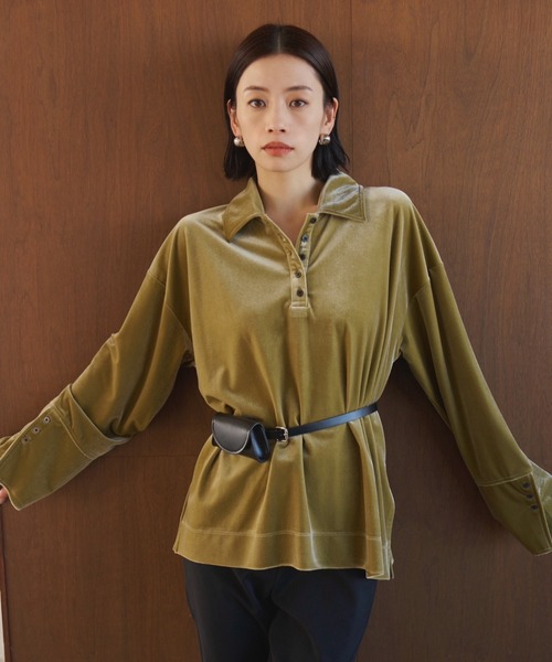 ー ディテール ー程よい光沢感で動くたびに表情が変わるベロアポロトップス。ゆったりしたサイズ感やビッグカフスなどディテールにも拘った1着。ダークなブラウンとピスタチオのようなライトグリーンの展開。【ベロア素材のお取り扱いご注意】洗濯は手洗いでお願いします。もみ洗いは避け押し洗いしてください。洗濯の際は色落ちしますので単独で洗い、湿気を含んだ状態や水につけたままで放置しないでください。洗濯により多少縮む場合がございます。摩擦や雨や汗などで他の衣類に色が移る場合がございます。白物(単色)との着用はお避け下さい。【色味に関しての注意事項】商品画像は、ストロボなど撮影機器の使用や光の当たり具合、お使いのスマートフォンやパソコンなどの閲覧環境により、実際の色味と異なって見える場合がございます。予めご了承ください。【SNS動画掲載アイテム】@aic_official上記の公式インスタグラムアカウントにて着回し動画を掲載しております。是非ご覧くださいませ。★お取り扱い注意事項★下記をご確認いただきご了承の上、ご購入ください。・着用中の摩擦などにより、ピリング(毛玉)が生じる場合があります。・洗濯の際は色落ちしますので単独で洗い、湿気を含んだ状態や水につけたままで放置しないでください。・濃色の製品は、摩擦や汗、雨などで濡れると、ほかの衣料に色移りする場合がございますので、充分ご注意ください。・商品の写真はサンプル品を撮影している為、実際の商品とは仕様や加工、加工によるダメージ、サイズ等が若干異なる場合もございます。・初回販売分と生産時期の異なる商品は、色味や加工等若干異なる場合がございます。・システムの都合上下げ札の税込み価格表記が商品ページの税込み価格と1円ずれている場合がございます。・掲載画像の商品の色味は、屋外や屋内の光の照射や角度により実物と色味が異なる場合がございます。また表示のサイズ感と実物は若干異なる場合もございますので、 ・着用、お取り扱いの際は、商品についている品質表示とアテンションタグを必ずご確認下さい。