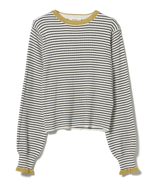 オンオフ兼用のフェミニンニット ■デザイン 1枚で着映えし、顔回りを華やかに彩るニットプルオーバー。繊細な輝きのラメ糸を編み込むことで、さりげなく上品な光沢を放ちます。甘くなりがちのフリルデザインもエッジの効いた配色で洗練された印象に。程よい伸縮のあるシルエットが大人のカジュアルスタイリングに重宝します。 ■コーディネート 配色アクセントが視線を上に集め、スタイルアップ効果も抜群。デニムなどワイドパンツ合わせはもちろん、スラックスやタイトスカートを合わせればオフィスでも活躍する程よい華やぎコーデが完成します。アウターを羽織ってももたつかないのも嬉しいポイント。 ■素材 柔らかく優しい肌触りで程よくフィットする着用感。 ■ケア方法 手洗い可(詳細は商品についている洗濯表示タグをご覧ください。) ※光の当たり具合やパソコンなどの閲覧環境によって実際の色味と異なって見える場合がございます。予めご了承ください。 ※商品の色味は商品単体で撮影した画像をご参照ください。