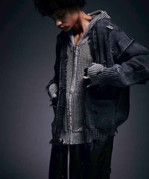 DankeSchonダメージ加工とアシッドウォッシュを掛け合わせた、グランジ感あふれる天竺素材のカーディガン。全体に施されたランダムなクラッシュホールと色落ち表現がヴィンテージライクで存在感のある一着に仕上がっています。程よくルーズなシルエットで羽織るだけでスタイリングにエッジをプラスできるアイテムです。POINT・アシッドウォッシュ加工によるムラ感のある表情・随所に施された大胆なダメージデザイン・Vネック仕様でレイヤードしやすいバランス・柔らかい天竺素材でストレスフリーな着用感STYLE TIPインナーにはプリントTやタンクトップを合わせてダメージ部分を活かしたレイヤードがおすすめ。デニムやカーゴパンツで王道ストリートにもスラックスと合わせてモード寄りにも振れる万能さが魅力です。一枚ごとに表情が異なる加工感が最大の魅力。羽織りとしても主役トップスとしても使えるDankeschonらしい攻めのデザインを楽しめるカーディガンです。DankeSchon・・・DankeSchonとは、このブランドの核となるキーワードD digitaliyデジタル式A Architect創造者N neologism新表現K kittenish悪ふざけE engrossing心を奪うの頭文字を組み合わせたものにドイツ語のSchonを付け、ブランドの意図に賛同してくれる人達に感謝の意味を込め、「DankeSchon(ありがとうの意味)」としている。