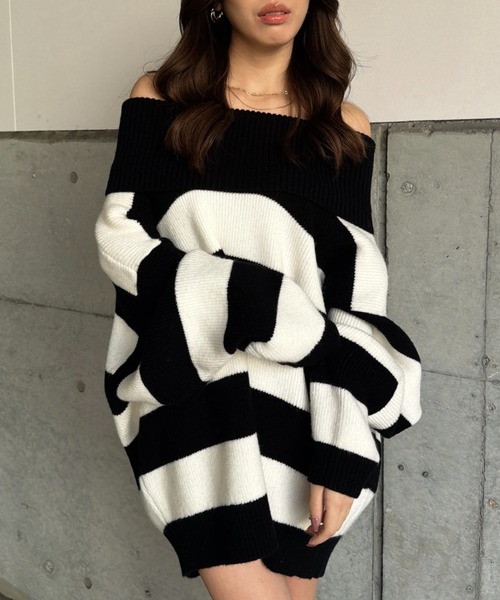 ■detail折り返しタートルとオフショルの2WAY仕様になったボーダーニットトップス。アウターを羽織るときは折り返しタートル仕様にすれば、肩や袖周りのもたつきを抑えてくれます。また、首元をしっかり覆うことで、寒さから守る役割も果たしてくれます。首元にボリュームがあるときは、アップヘアーにすると顔回りがすっきりするのでオススメ。オフショル仕様で着ると、デコルテと肩の露出で色気が出て雰囲気がガラッと変わります。肌見せさせることで、デコルテ周辺に少し物足りなさを感じる方は、おろしヘアーやネックレス、ピアスなどの小物をプラスするのが◎シーンによって着方のアレンジができるのが2WAYの魅力。太めのボーダーと、ダボっとオーバーなサイジングが存在感ある1着。ボリュームがあるので、すっきりとしたシルエットのボトムスと合わせていただくと、バランスの良いコーディネートが楽しめます。着丈が長めなので、小柄な方はミニワンピース風に着ていただくことも可能。もっちりとした柔らかさと肌触りの良さが特徴で、優しく体を包み込んでくれるような着心地となっています。【生地感】透け感:なし裏地:なし 伸縮性:なし 生地の厚さ:厚い<おすすめ便利機能>▼商品のお気に入り登録▼商品ページ内のハートマークをクリック!完売カラーの再入荷や、ラスト1点の通知、お得なお値下げの通知を受ける事ができます。▼ブランドのお気に入り登録▼新商品や再入荷など、ブランドのお得な情報をいち早くお知らせします。ぜひご活用ください!