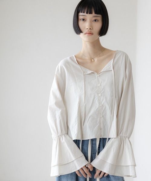 ■素材■ 綿100%の強撚糸を使用した、さらりと心地よいシャリ感が魅力の素材。 仕上げに生地洗い加工を施すことで、程よいシワ感と柔らかな肌触りを引き出し、 ナチュラルでこなれた風合いに仕立てました。 清涼感のある肌触りで、汗ばむ季節も快適。 ギンガムチェックと無地の選べるアソート展開で、 デイリーからお出かけまで華やかに彩る主役級アイテムです。 ■デザイン■ 目を引くボリュームたっぷりのベルスリーブと、 フロントのリボンが旬なアクセント。 着丈はやや短めに設定し、裾にフレアを入れて立体感あるシルエットに仕上げました。 ■スタイリング■ コンパクトな着丈なのでハイウエストのボトムスと相性抜群!スタイルアップも叶えます◎