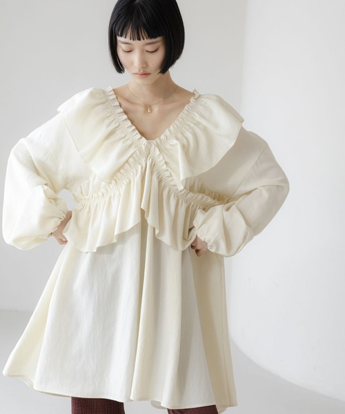 ■素材■再生繊維セルロースとレーヨンのしなやかさにナイロンの耐久性をプラスした、程よい厚みの中肉素材。洗いざらしたようなナチュラルな質感で、レーヨンの特徴である程よい光沢感と滑らかでソフトな風合いが魅力です。中肉の厚みにより、しっかりとしつつも柔らかな着心地を実現します。■デザイン■最大の特徴は、動かすことで印象をガラリと変えられる胸元のフリルデザイン。肩を覆うように広げてフェミニンなケープ風に着こなしたり、斜めに流してアシンメトリーなモードスタイルを楽しんだりと、その日の気分に合わせてアレンジが可能です。フリルを中央に寄せて華やかなアクセントにするなど、1枚で何通りもの表情を楽しめる、着回し力抜群の主役級アイテムです。 ■スタイリング■一枚でミニワンピースとしても、パンツと合わせてチュニックのように着ることも様々な着こなしが楽しめます。