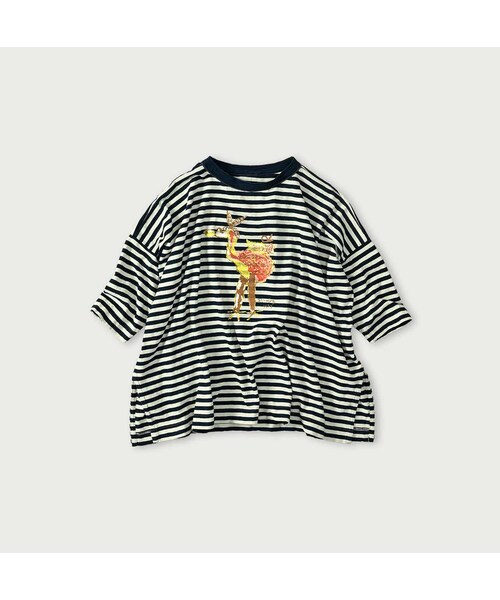 小気味いいボーダーカラリと晴れた空の下、太陽に話しかけるみたいにのびのびと育った綿。オーストラリアの自然がくれた、どこか品を感じるやさしい手触りです。鮮やかなインディゴとバランスの良い生成でポップなボーダーを編みました。カラフルでお茶目なフラミングウェイが、バンダナを巻いて、おしゃれをしています。油絵のように濃く、鮮やかに描きました。深いスリットのおかげで、動きのある女性らしいTシャツです。