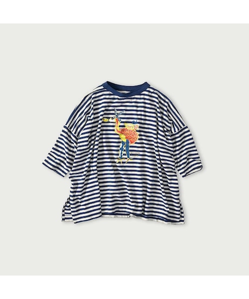 小気味いいボーダーカラリと晴れた空の下、太陽に話しかけるみたいにのびのびと育った綿。オーストラリアの自然がくれた、どこか品を感じるやさしい手触りです。海をかんじるシロとブルーで爽やかなボーダーを編みました。カラフルでお茶目なフラミングウェイが、バンダナを巻いて、おしゃれをしています。油絵のように濃く、鮮やかに描きました。深いスリットのおかげで、動きのある女性らしいTシャツです。