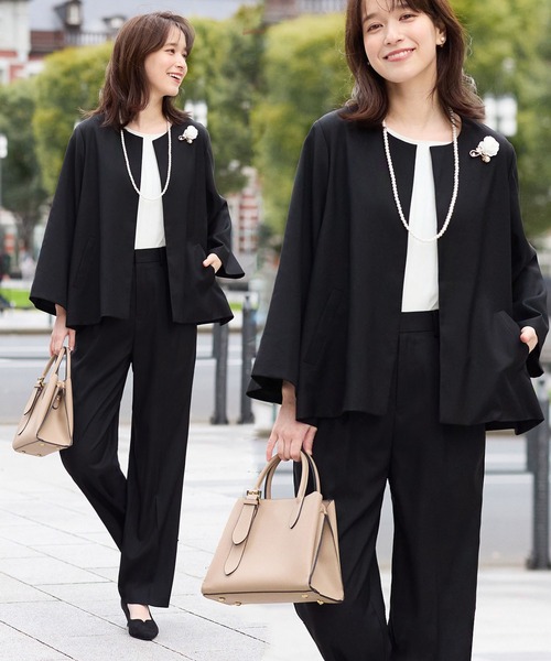 フォーマルスタイルはもちろん、トレンド感を取り入れたい日にもおすすめ! 2タイプのパンツからお好きなスタイルをセレクトできる、自由度の高いセットアップでぴったりなスーツを見つけて ストレートタイプ(ブラック系1、ネイビー系1) テーパードタイプ(ブラック系2、ネイビー系2) ●Detail/特徴 <ジャケット> 裾に向かってフレアーに広がるテントライン。 ノーカラークルーネックは首回りをすっきり見せてくれます。 背中に裏地をつけないことで、背中側は生地の伸縮性を活かし、着用時の窮屈感を軽減させました。 <パンツ> 2タイプのシルエットの中からお好みのシルエットをセレクト可能! 脚のシルエットをカバーしながらまっすぐなラインを強調して細見えを演出するストレートタイプと 裾に向かって細くなるシルエットでボリューム感のあるジャケットでもすっきり着こなせるテーパードタイプをご用意。 きちんと見えする前ファスナー&着心地楽ちんのウエスト後ろゴム仕様。 フロントタック入りで、脚長見せ効果も♪ シワになりにくい素材だから、長時間の座るシーンでも快適です。 ●おすすめシーン セットアップできちんとしたシーンにも、単品使いでデイリースタイルにも! 入園式、卒園式、入学式、卒業式、参観日、保護者会、七五三、お宮参り、謝恩会 二次会、オフィス、通勤、リモート会議 ●Fabric/素材 程よい張り感と上品な光沢感が特長。 長時間着用しても、型崩れしにくく楽ちん×きれい♪ 上品でキチンと見える、サラリとした質感です。 <ウォッシャブル>自宅の洗濯機で洗えてお手入れ楽ちん。 <防シワ>シワになりにくくお手入れ楽ちん。 <UV対策>紫外線対策もできてうれしい! <抗菌防臭(※)テープ付>脇下・股ぐり部分に抗菌防臭テープ付で安心感をプラス! 裏地の下にテープが貼ってあるので、目立たず効果を発揮 ※全ての菌に対する効果ではありません。 【ジャケット】 ● ポケット付 【パンツ】 ● ウエスト後ゴム使い ● ポケット付 ● 前ファスナー 洗濯:洗濯機OK --------------------------------------------------------------------- 【お買物をよりお楽しみいただく為に】 ▼商品のお気に入り登録をおすすめします♪ 『♥をクリック!』 完売カラーの再入荷やラスト1点の追加、 セールの際の通知を受ける事ができます。 ブランドのお気に入り登録もご一緒にお願い致します。 ---------------------------------------------------------------------