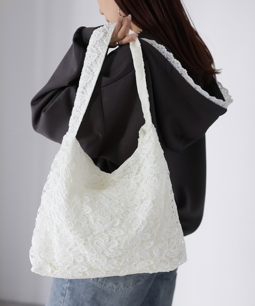 【Riberry レーストートバッグ】\繊細レースで、いつものコーデにさりげない可愛さを/A4も入る便利なサイズ感!持つだけで女性らしさが引き立つレーストート♪繊細なレースの表情が、スタイリングにさりげない華やかさを添えてくれるレーストートバッグが登場しました。全面にあしらわれたフラワーモチーフのレースが甘くなりすぎず上品な印象を演出し、いつものコーデにプラスするだけで女性らしさを引き立ててくれます!軽やかなレース素材ながらスクエアフォルムで、見た目以上の収納力も魅力◎財布やポーチ、スマートフォンなどの必需品はもちろん、A4サイズも横にすっぽり入るのでサブバッグとしても活躍してくれるサイズ感です。ナチュラルなホワイトカラーなので、カジュアルからフェミニンまで幅広いスタイリングにマッチ。デニム×Tシャツのラフなコーデに合わせて抜け感を出したり、ワンピースやスカートスタイルに合わせてよりフェミニンに仕上げるのもおすすめです。春夏はもちろん、シンプルな秋冬コーデのアクセントとしても活躍。コーディネートに「さりげない可愛さ」をプラスしたい日に、ぜひ取り入れてほしいアイテムです。・裏地あり・内ポケットなし・ショルダーなし・マグネットボタン開閉・透け感ややあり※この商品は生産時期によりカラー等に個体差が生じることがございます。予めご了承ください。※この素材は摩擦(特に湿った状態での摩擦)や雨、汗でぬれた際には他の衣料等に色が移ることがございますのでご注意ください。※商品の梱包には細心の注意を払っていますが、通販の特性上、到着時に畳みシワがついている可能性がございます。予めご了承ください。※その他詳しい取扱いについては商品付属のタグ及び品質表示をご覧ください。【Information】◆《お気に入り登録》がオススメ◆・「商品のお気に入り登録」で再入荷通知や、ラストの通知、セール通知も受け取ることが出来ます。・「ブランドのお気に入り登録」で新商品や再入荷など、お得な情報を受け取ることが出来ます※撮影時のライティング、太陽光、ご覧になっているモニター・PC環境により、実際の商品と色味が異なって見える場合がございます。予めご了承をお願い致します。