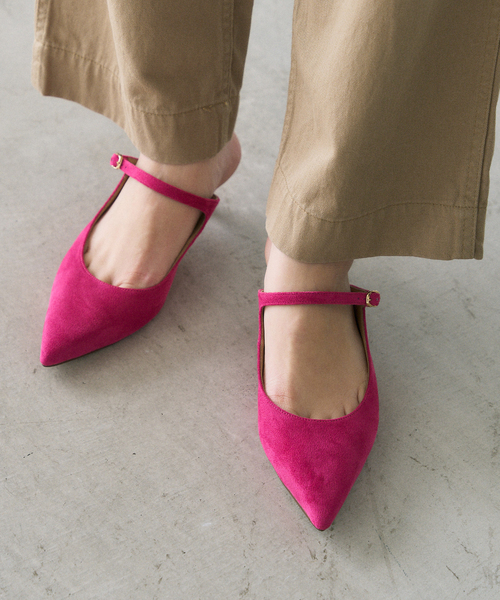 すっきりとしたポインテッドトゥと、くびれたシルエットがキレイ見えの4.5cmヒールで上品に履けるミュールパンプスです。ベルト金具にはアクセサリーのように二重に重なったデザインのバックルを採用しました。素足にはもちろん、肌寒い時期は薄手のソックスを合わせても◎細身に見えて足当たりが柔らかく、インソールはクッションが効いているのでヒールが苦手な方にもおすすめです。**********************【スタッフ着用コメント】《スタッフS》普段サイズ:23.5/着用サイズ:Mサイズ感: 普段のサイズMでぴったり。履き心地:クッションが効いている。幅の締め付けをあまり感じないので楽に履ける。《スタッフI》普段サイズ:22.5or230/着用サイズ:Sサイズ感: Sでぴったり。履き心地:インソールのクッションが気持ちよく痛くなりにくい。ポインテッドトウなので脚がキレイに見えます。***********************カラーにより素材が異なります。ブラック・ピンク 甲材:合成繊維キャメル・シルバー 甲材:合成皮革*サイズによりヒールの高さが多少前後することが御座います。予めご了承ください。*照明の関係により、実際よりも色味が違って見える場合があります。またパソコン・スマートフォンなどの環境により、若干製品と画像のカラーが異なる場合もございます。*商品の色味は、商品アップ画像をご参照ください。