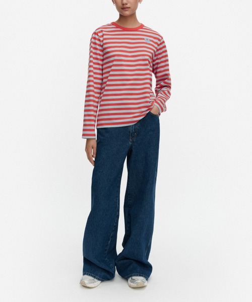 『Marimekko Kioski』 マリメッコのアイコン的プリントを再解釈し、無限のワードローブを提案するジェンダーニュートラルなストリートウェア Marimekko Kioski(マリメッコ キオスキ)。「他人の真似はせず、自分らしく」をキーワードに、作り物ではないオーセンティックなスタイルを追求したコレクション。【テキスタイルデザイン:Maija Isola(マイヤ・イソラ)】 Unikko(ウニッコ):花【テキスタイルデザイン:Annika Rimala(アニカ・リマラ)】 Tasaraita(タサライタ):ボーダー平等性がコンセプトのボーダー柄が目を惹く長袖Tシャツ。左胸にあしらったUnikko柄のフラワーモチーフがさりげなくスタイリッシュなデザインアクセント。オーバーサイズのゆとりのあるフィット感も特徴。肌触りに良いコットン生地で、着心地も抜群。コーディネートのアクセントになるアイテムです。※品質表示は、Marimekko社の付けた洗濯表示を日本国内の基準に合わせ付け替えております。本国のタグはカットされておりますので、予めご了承ください。※断裁により商品ひとつずつの柄の出かたが異なるため、表示画像のディテールと多少異なるデザインのものが届く場合がございます。予めご了承ください。モデル着用サイズ:M/038/004
