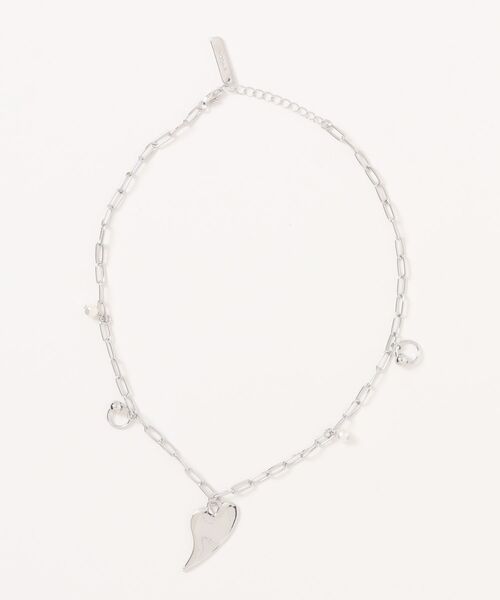 3種類のパーツを付けたネックレス。 パーツは動きがあり存在感のあるデザインです。 中央のハートパーツをポイントに、ボディピアスパーツ・パールは小さいサイズを付けバランスの良い仕上がりにしています。 付けるだけで今っぽい着こなしになるネックレスです。