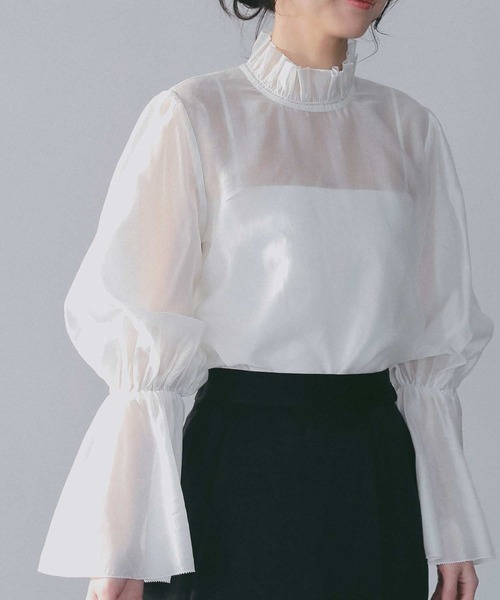 オケージョンからオフィスカジュアルまで幅広く活躍する、シアーシャツ素材のブラウス。 (AJUGA.セレモニーシリーズ2026) 軽やかで上品な透け感が、装いに抜け感をプラスします。細やかなフリルをあしらったスタンドネックが、顔まわりを華やかに演出。 袖にはトレンド感のある大胆なフレアスリーブを採用し、動きのあるエレガントな印象に仕上げました。同オケージョンシリーズのジャケットと合わせると、袖口からフレアがのぞき、コーディネートのアクセントに。 後ろあきボタン仕様で、バックスタイルまで抜かりなく仕上げています。 一枚で着ても、レイヤードしても映える、着回し力の高いブラウスです。 _____________________ 透け感:ややあり 裏地:なし 厚さ:薄め 伸縮性:なし お手入れ方法:手洗い推奨 ____________________ 【ATTENTION】 商品写真はできる限り現品を再現するように心がけていますが、ご利用のモニターにより差異が生じます。サイズや重さなどに多少の個体差が生じる場合がございます。製品の仕様およびデザインは改善等のため、予告なく変更する場合がございます。 【おすすめシーン】 卒業式・入学式・入園式・卒園式・セレモニーセットアップ・オケージョンドレス・フォーマルセットアップ・フォーマル
