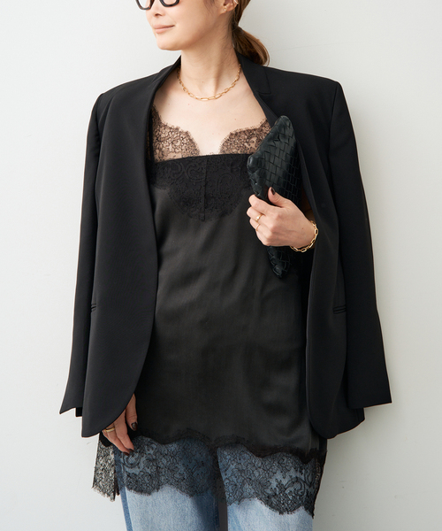 Raspailの美しいレースキャミソール。国産のシルクサテン生地にスエード加工をかけ、あえて光沢を抑えることで、雰囲気のある生地に仕上げた1枚。100年以上の歴史を誇るレースメーカー、フランスのSOLSTISS社のレースを使用しています。SOLSTISS社は創業当時のリバーレース機を、今もなお稼働させている世界でも極めて貴重なレースメーカー。繊細なレースを胸元と裾に贅沢に使用した美しいキャミソール。ジャケットの組み合わせや、Tシャツ等とのレイヤードスタイルのバランスを考え、着丈を少し長めに設定しているので、大人な雰囲気が漂うエレガントなコーディネートが完成します。【Raspail/ラスパイユ】"raspail"とは、セーヌ川の南・パリの14区にある、中世からの古い町並みと現代のモダンな建築物に彩られた町の名前です。この地区は昔から、多くの芸術家達に愛されてきました。"raspail"ブランドは、この町の風景をイメージしながら生まれたコレクションです。今の時代ではちょっと古くさい感じがして、忘れ去られているような洋服たちをもう一度見つめ直していきます。そして、今の女性にも楽しんでもらいたい、という思いを込めて、現代風にアレンジしました。※メーカー型番:RB-278※サイズについて弊社販売サイズ:メーカーサイズフリー(999):F※カラーについて弊社販売カラー名:メーカーカラー名ブラック(001):BLACK※取り扱いについては、商品についている洗濯表示にてご確認下さい。※照明の関係により、実際よりも色味が違って見える場合がありますまたパソコン・スマートフォンなどの環境により、若干製品と画像のカラーが異なる場合もございます。※商品の色味は、商品アップ画像をご参照ください。※こちらの商品はお一人様1カラー・1サイズにつき1点までの購入とさせていただきます。VMID:1152813625※着用動画はブラウザのみからご覧頂けます。本体:ドライクリーニング
