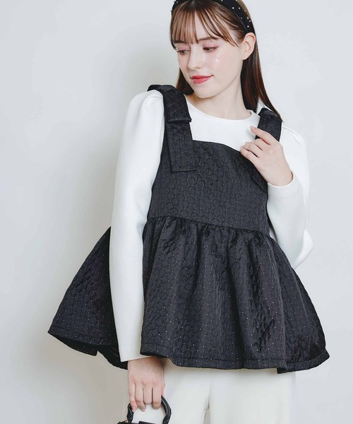 ひと目でときめくショルダーリボンジャガードビスチェ ほんのりと光沢感のあるひし形のジャガード生地を使用。生地には等間隔にゴールドの糸が織り込まれており、キラキラと煌めく一枚になっています。太めのストラップで安定感があり、肩に立体的なリボンを施し、可愛さをプラス。切り替え部分にはたっぷりギャザー。ふんわり広がる立体シルエットが、体のラインを優しく包みます。また、高めの切り替え位置によってスタイルアップ見えも期待できます。後ろはホックとファスナーで着脱もらくちん。甘さと大人っぽさを両立したブラックが、大人レディの毎日にそっと寄りそう一枚です。※リボン縫い付け(解けません)※後ろホック・ファスナー※YKKファスナー【詳細情報】厚み:□薄手 □ふつう ■厚手透け感: ■なし □あり光沢感: ■なし □あり伸縮性: ■なし □あり裏地: □なし ■ありポケット:■なし □あり重量: 約390g※撮影場所や明るさにより実際の商品と色味が若干異なる場合がございます。 ☆商品のお気に入り♡登録を押せば”再入荷通知”や”残りわずか通知” 値下げのお知らせが届きます!お気に入りのブランド登録していただければ新商品入荷のお知らせも届きますので是非登録してみて下さい。
