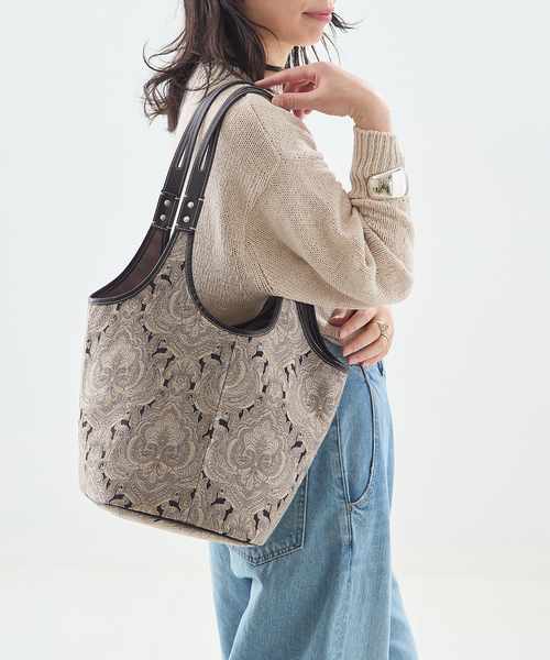 【2026 SS】 JOURNAL STANDARD L'ESSAGE クラシカルなペイズリー柄が印象的なトートバッグ。 落ち着いたベージュとブラックのコントラストが、洗練された大人のスタイルにぴったりです。肩掛けしやすい長めのハンドルと、たっぷり収納できるサイズ感で、デイリーからお出かけまで幅広く活躍。シンプルなコーデに合わせるだけで、上品な華やぎを添える一品です。 【A VACATION/ア ヴァケーション】 『ア ヴァケーション』は大手セレクトショップの元アクセサリーバイヤーである吹上肖氏によるバッグブランドで2018年秋冬スタート。 家業がバッグメーカーだった事もあり、幼少期より素材や付属に触れる機会も多く、自然と自身のブランドを始めることになりました。 「ファッションの一部として、洋服とのスタイリングに自由に制約なく合わせられるバッグコレクションを作りたい。」 女性にとって使い勝手が良い機能性やサイズ感を備えながら、少し振り切った個性とディテールを駆使して情緒的にバッグを仕上げています。 熟練の職人を擁する日本のクオリティーは、洋服をデザインするような奔放なアイディアを美しい商品に仕上げています。 ※メーカー型番:26SS-A110-00-04 ※カラーについて 弊社販売カラー名:メーカーカラー名 ブラック(001):ONYX ※サイズについて 弊社販売サイズ名:メーカーサイズ名 フリー(009):F ※取り扱いについては、商品についている品質表示でご確認ください。