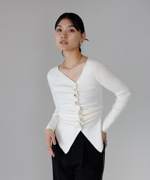 ギャザーが描く、しなやかなドレープニット アシンメトリーに配置したフロントのボタン開きが、視線を自然に流しながら、立体的な表情をつくります。 中心に寄せたタックギャザーが柔らかな陰影を生み、シルエットに奥行きを添えるデザイン。 サイドにもギャザーを加えることで、身体に沿うしなやかなドレープを強調します。 ネックラインと裾の左右差のあるカッティングで仕上げ、動きのある印象に。 華やかさとモードなニュアンスを併せ持つ、デザイン性の高いニットトップです。 ------------------------ 透け感/オフホワイトややあり 光沢感/なし 伸縮性/あり 裏地/なし 厚み/普通 ------------------------ ※着用中の摩擦や、汗、水濡れにご注意ください。濃色品は、色落ちや他のものへ色移りすることがあります。 ※摩擦により毛羽立ち、毛玉が生じますので、着用後はブラシなどで表面を整えてください。 【必ずご確認の上、ご検討ください】 ※商品画像は撮影時の光や角度、お使いの照明やモニター環境により実物の色味と異なって見える場合がございます。 ※サイト上のカラー・サイズ表記と商品タグのカラー名・サイズ名が異なる場合がございます。 ※着用、お取り扱いの際は商品についておりますアテンションタグ、洗濯ネームを必ずご確認ください。 ※生産時期により、色・素材・サイズ感など多少異なる場合がございます。 ※商品によっては、繊維や染料のにおいが感じられる場合がございます。 数日のご使用や陰干しなどで匂いはほとんど感じられなくなりますのでお試しください。 ※通販の特性上、到着時には畳みシワがついている場合がございます。 【Information】 ◆《お気に入り登録》がオススメ◆ ・「商品のお気に入り登録」で再入荷通知や、ラストの通知、セール通知も受け取ることが出来ます。 ・「ブランドのお気に入り登録」で新商品や再入荷など、お得な情報を受け取ることが出来ます。