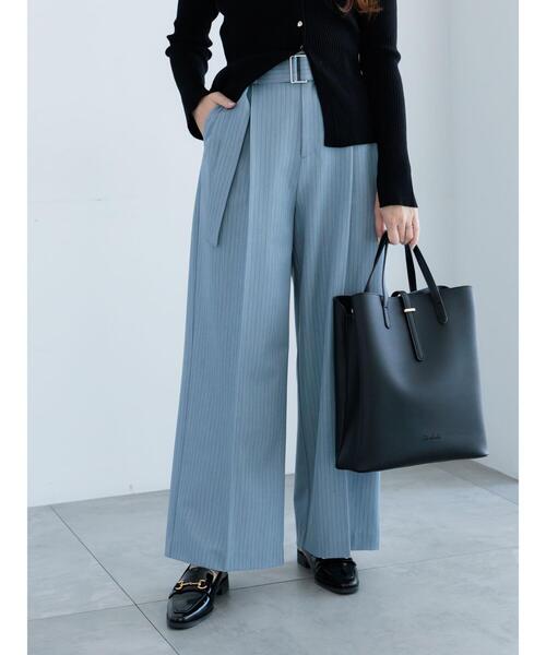 縦ラインを強調するピンストライプ柄がすっきりとした印象を与えるワイドパンツ。共地ベルトによりウエスト周りのディテールがアクセントになり、スタイリッシュな印象に。縦ラインを強調するストライプ柄で、脚長効果も抜群です。腰まわりにゆとりを持たせつつ、程よくゆとりのあるワイドシルエットが、動きやすさとこなれ感をプラス。シンプルなトップスと合わせるだけで洗練されたスタイリングが完成します。 雰囲気のあるワントーンコーデもおすすめです。ブラウスやニットを合わせるだけで、オンオフ問わず活躍する一本です。※商品画像は、撮影環境やお客様のご利用のPC・スマートフォンのモニター環境などにより実物と色味に差異がある場合がございます。※着用画像はサンプルを使用して撮影しております。製品と一部仕様が異なる場合がございます。予めご了承ください。【その他採寸】F ウエスト:[後ゴム仕様]66cm 全長:[ベルト]116cm