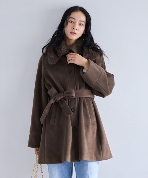 あったかくて可愛いが叶う。襟元のFOX FARが華やかなステンコート。【2025 Autumn/Winter】【25AW】【2026 Spring】【26SS】<POINT>・スタイルUPを叶えてくれるミドル丈のAラインシルエット・ウエストは共地の紐でシェイプして着て頂くのがおすすめ・ネックのファー襟はとり外可能なので、着用シーンによって簡単に取り替えして頂けます【デザイン・シルエッット】ステンカラーのAラインシルエット。ウエストがシェイプできるように共地のベルトがついています。ハンサムなステンカラーなので、毛足短い素材をセレクトし可愛らしくなり過ぎず上品に仕上げました。襟のファーは取り外し可能です。【素材】軽くてケアーのしやすい短い毛足の素材を使用しています。襟のファーはFOX調の毛足の長い素材。【カラー】グレー、キナリ、ダークブラウンの着回しのきく3色展開。【おすすめのスタイリング】襟のファーをつけてミニボトム合わせてスタイリングして頂くのがおすすめです。オンオフで使えるデザインなので、スラックスなどハンサムなボトムとも相性が良いです◎。-----------------------------裏地:あり光沢感:なし透け感:なし伸縮性:なしポケット:ありボタン:あり(開閉可)生地の厚さ:やや厚手その他仕様:ファーとベルト付き(取り外し可能)季節:秋、冬-----------------------------【モデル着用サイズ】モデル身長:168cm 着用サイズ:F※画像の商品はサンプルです。 実際の商品と仕様、加工、サイズが若干異なる場合がございます。※画像によっては実際の色味と異なる場合があります。正しい色味は生地アップ画像をご確認ください。