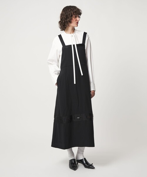 エプロンのようなデザインのワンピ―ス。バックスタイルはストラップがクロスしており、カットソーやシャツの上から重ねたり、ブラトップやキャミソールで素肌をのぞかせたスタイルも素敵です。甘くならないシックなブラックで抜け感のあるモードな印象に。スリット開きからタイツやパンツがちらっとみえ、着こなしに奥行きを生みます。============================裏地:なし透け感:なし光沢感:ややあり============================【注意事項】※商品に「取り扱い上の注意書き」、「洗濯表示」がございます場合は、使用前に必ずご確認ください。※商品画像は、光の当たり具合やパソコンなどの閲覧環境により、実際の色味と異なって見える場合がございます。あらかじめご了承ください。※商品の色味の目安は、商品単体の画像をご参照ください。店舗へお問い合わせの際は、全国の6(ROKU)各店舗まで下記の品名/品番をお申し付けください。品名:6 STN GGT OP ** 品番:86262000007