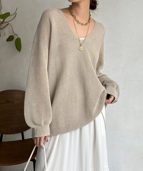 ■2026 SPRING &SUMMER ITEM■ ほどよくラフ、きれいに決まる深Vプルオーバー 深めのVネックがつくる、抜け感のある大人カジュアルな雰囲気。 ガーター編みならではの立体的な編地が特徴で、 見た目にもやわらかさが伝わる素材感です。 糸はほどよい太さで編まれており、空気を含んだような軽さとふんわりとした膨らみで、肌に触れた瞬間もチクチクしにくいのが魅力です。 ゆったりシルエットで身体のラインを拾いにくく、リラックスした着心地で、 重ねるだけでコーデが完成する、着回し力の高い一枚ですよ! - POINT - ・深めのVネック ・レイヤードを楽しめる ・ロングシーズン着用可能 -------------------------------- 洗濯:手洗い可能 透け感: ややあり 裏地: なし 伸縮性: ややあり 光沢感: なし -------------------------------- 【 ♡ をクリックでお得な情報をお知らせいたします 】 〈 商品のお気に入り登録 〉 お気に入りアイテムのお値下げ・再入荷・在庫ラスト1点など通知を受けることができます。 〈 ブランドのお気に入り登録 〉 DOUDOUの新商品や再入荷、セール、クーポン配布などお得な情報を受けることができます。 -------------------------------------- ※ 生産の都合上、お届け時期が前後する場合がございます。 ※ 掲載画像の商品の色味は、 撮影場所や光の当たり具合などにより色味が異なって見える場合がございます。 また、お客様のお使いのPC・スマートフォン等のモニター環境などにより色味が異なって見える場合がございます。予めご了承の上ご注文ください。 ※ 着用、お取り扱いの際は、商品についている品質表示とアテンションタグを必ずご確認下さい。