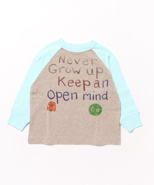 先入観を持たず子供心を忘れないと手描きで描いたメッセージTシャツ。ラグランスリーブは肩巾の小さな子供が一番可愛い形です。