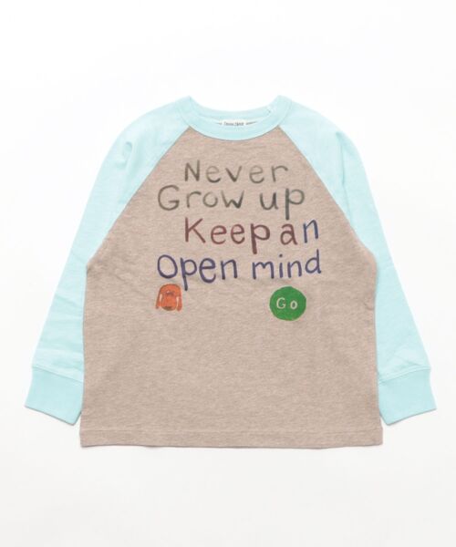 先入観を持たず子供心を忘れないと手描きで描いたメッセージTシャツ。ラグランスリーブは肩巾の小さな子供が一番可愛い形です。
