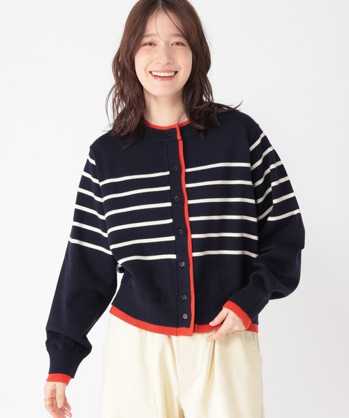 レイヤードデザインが新鮮な一枚一枚でサマになるニットカーディガンーーー【素材】モッチリとした風合いが特徴のストレッチ素材を使用。着心地の良さも特徴です。【デザイン】12ゲージで作成されたニットカーディガン。シンプルカラー使いのボーダー身頃に襟・前立て・袖口から除くレイヤード配色がアクセントです。袖回りはゆったりとしながらも、肩周りは華奢見えするドルマンスリーブのような特徴的なアームホールラインがポイント◎ボーダーや配色カラーがコーデのアクセントに。トップス ニット カーディガン カーデーーー【スタイリング】ボトムスを選ばず幅広いスタイリングを楽しめる一枚。パンツ合わせで大人なカジュアルスタイリングに、フレアスカートやナロースカート合わせで女性らしいスタイリングに。釦を外してロンTやワンピースに羽織っていただいても素敵です。