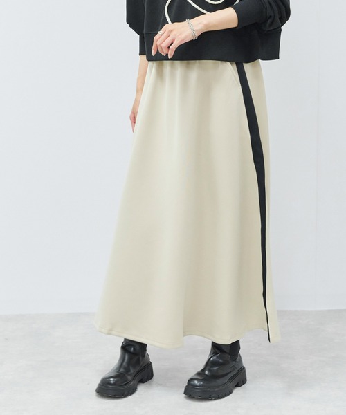 【ディテール】シンプルながらも洗練された印象を与えるミディ丈のフレアスカートは、サイドのラインがスポーティーさをプラスしたひと品。ウエスト部分の切り替えデザインが腰回りをすっきりと見せ、程よく広がる裾ラインが歩くたびに美しく揺れて女性らしさを引き立てます。 【ファブリック】 ほど良く伸縮性があり動きやすいグロッシーダンボールニット素材を使用。 【スタイリング】 トップスを選ばない万能アイテムなので、シンプルなニットやブラウスと合わせたスタイリングが楽しめそう。 【クリーニング】 手洗い可