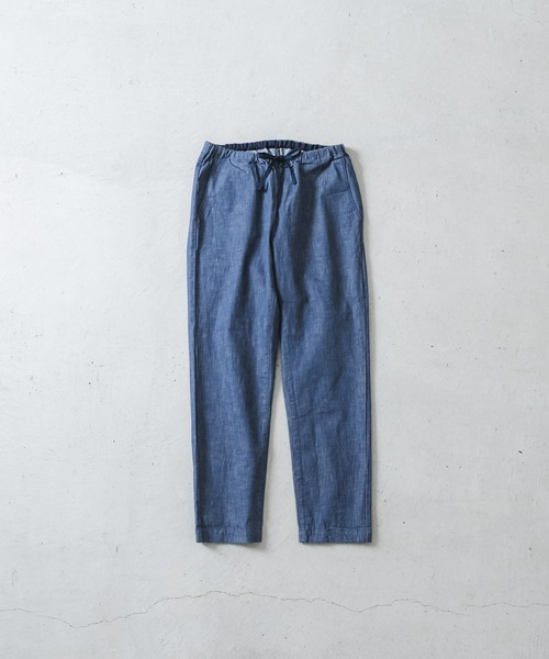 しっかりとした質感ながら、軽やかな穿き心地を体感できるストレッチデニムパンツ。ウエストはゴム+ドローストリングのイージー仕様で、もも周りにもゆとりを持たせることでリラックス感のある穿き心地に仕上げています。裾に向かってしっかりとテーパードをかけ、すっきりとしたスラッシュポケットを採用することで、快適さとスッキリとした見た目を両立。背面にはあえてワーク調の貼りポケットを配し、さりげなくカジュアルな表情をプラスしています。【ストレッチデニム】綿をベースにポリウレタン2%を配合した、程よい伸縮性のあるストレッチデニム生地。デニムらしい表情やしっかり感を保ちながら、動きやすさと快適な着用感を兼ね備えています。身体の動きに自然にフィットし、長時間の着用でもストレスを感じにくいのが特徴です。