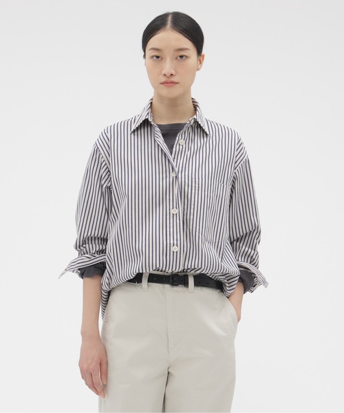 ヴィンテージのメンズストライプシャツに着想を得たコットンシャツ。細番手の糸を高密度に織り上げた、上品で整った表面感が特長。特殊な柔軟加工を施すことで、やわらかく肌なじみの良い風合いに仕上げた素材感。白場をあえてグレイッシュに整え、落ち着いたワークストライプの表情にまとめた一枚。背中心に襟ぐりから続くボックスプリーツとスクエアステッチを配したバックデザイン。ヨーク切り替えを用いず、背面にさりげない表情を加えた、シンプルで印象に残るバランス。※こちらはウィメンズの商品です。 ▽お気に入り登録 <商品のお気に入り登録> 完売カラーの再入荷通知や、ラスト1点の通知、セールの通知も受け取ることができます。 <ブランドのお気に入り登録> 新商品や再入荷など、いち早くブランドの情報を受け取ることができます。