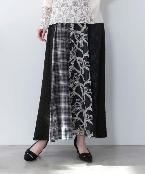 + iS ScoLar商品 +ドットのフロッキープリントをあしらった格子柄、チェック、刺繍入りチュール、レース——異なる4種類の素材を贅沢に組み合わせた、表情豊かで特別感のある異素材MIXスカート。透け感のあるチュールやレースと柄生地のコントラストが見た目にも楽しく、歩くたびに素材の重なりが生み出す動きや表情の変化が楽しめます。カラーはフェミニンでやわらかな印象の05(アイボリー)と、シックで大人っぽい09(ブラック)の2色展開。お出かけスタイルにはもちろん、Tシャツやプルオーバーなどのカットソーと合わせた程よくカジュアルなデイリーコーデにもおすすめ。プリント入りトップスと合わせれば、より個性をプラスしたスタイリングも楽しめます♡■スタイリングitemはコチラ⇒【561204】●model:Mayu 169cm/66inch●model着用:09(ブラック)・05(アイボリー)(着用商品はサンプルの為、実際のデザインと変更がある場合がございます)ーーーーー裏地:あり透け感:やや透け感あり生地の厚さ:普通生地感:やわらかめ伸縮性:ややありポケット:なしーーーーー※ チュール使用※ レース使用取り扱いのご注意:※この製品は摩擦や水濡れにより色落ちにすることがありますのでご注意ください。※この製品は生地独特な風合いを出すために、製品加工してあります。(製品は1点、1点多少表情が違います)※この商品はデリケートな素材を使用しております。糸及び編組織の性質上、引っ掛け・引っ掛かりやすい為、着脱時や取り扱いにご注意下さい。