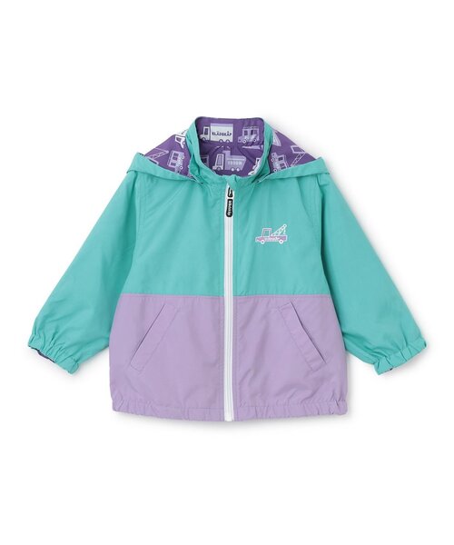コーデや用途に合わせてフードをつけ外しできるウィンドブレーカーです。 クレーン車のワンポイントデザインと、働く車を描いた総柄のリバーシブル仕様。 バイカラーの切り替えやミニマルなイラストがオシャレなポイントです。 撥水加工をほどこしており、雨の日のお出かけにおすすめ。 UVカット機能を備えているので、日差しが強い季節にも重宝します。 内側にお名前を記入できるタグつき。 【透け感】透けない 【生地の厚さ】普通 【伸縮性】なし 【裏地】なし 【ポケット】あり