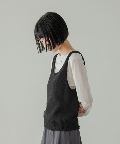 ■素材■綿混のコード糸のような素材を使用しています。さらっとして程よい厚みが特徴です。■デザイン■前後2WAY使用のニットベストです。コンパクトでありながら、小さすぎないサイズ感で春らしいアイテムです。■スタイリング■シャツかブラウスの上に合わせるのがおすすめです。暑くなってきたらシアーロンTに合わせたりとコーデのポイントになるアイテムです。
