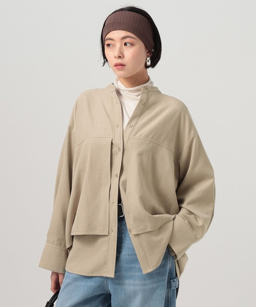 オーバーラップデザインが特徴的なチュニックシャツーーー★おすすめポイント★[1]しぼ感が特徴の素材[2]目を引くオーバーラップデザイン[3]スッキリ見えするバンドカラー[4]長めの丈感でお尻もカバーーーー[fabric]落ち感のある表面にしぼ感が特徴の素材使用。フィブリル感がありきれいめなのに、カジュアルにも着こなし可能な素材感。[design]オーバーラップ(2枚重ね)デザイン。チュニック丈でお尻もカバー。バンドカラーで首元はすっきり。大き目にした袖のカフスがデザインポイント。[styling]細めシルエットのパンツからワイドまで、かっこよくコーディネートできるアイテム。もちろんナローシルエットのスカートとの相性も◎。-------------------------------------≪お買い物をよりお楽しみいただくために≫◆商品のお気に入り登録(ハートマークをクリック)完売カラーの再入荷通知や、完売間近の通知、セールの通知も受けることができます。◆ブランドのお気に入り登録新商品や再入荷など、いち早くブランドのお得な情報を受け取ることができます。-------------------------------------