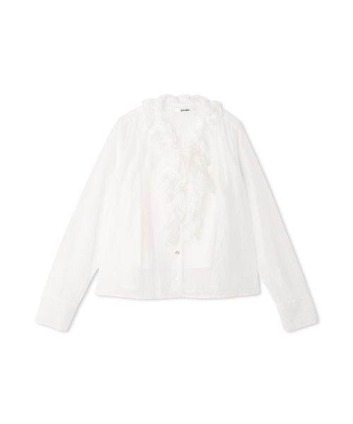 【大人気のボウタイにフリルディテールを加えてロマンティックに仕上げたバリエボウタイブラウス】【Design/Styling】艶感とシボ感のあるオーガンジー、繊細な花柄のレース、デニム調薄手の生地の3素材並びでお作りした、定番人気のボウタイブラウスが届きました。今季は、ボウタイ部分を細やかで上品なフリルディテールに仕上げ、豪華でモードな仕上がりに。フロントのフリルリボンは固定されているので結ぶ必要がなく、一枚で可愛く着られるデザインです。ブローチ付きニットプルオーバー(SWNT261051)を上に重ねたレイヤードスタイルもオススメです。エレガントなツイードジャケット(SWFJ261033)の中に着てもクラシカルな着こなしが楽しめます。ブラウスには、アジャスタ付きのインナーキャミソールが付いています。【Fabric】ナチュラルなシボ感を加えた艶感と透け感がフェミニンなホワイト、繊細な花柄レースを全体に使用したアイボリー、デニムライクな色味のシャツ生地でお作りしたライトブルーの3色展開です。透け感;あり裏地;インナー付属伸縮性;なし光沢感;なし生地の厚さ;薄手【おすすめ骨格タイプ】■骨格ストレート■骨格ウェーブ※照明の関係により、実際よりも色味が違って見える場合があります。またパソコン・スマートフォンなどの環境により、若干製品と画像のカラーが異なる場合もございます。予めご了承ください。商品の色味は、商品単品画像をご参照下さい。 ※商品画像はサンプルのため、色味やサイズ等の仕様に変更がある場合がございますので、予めご了承ください。