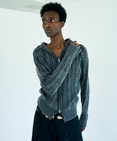 【 CAMPHORWOOD 26SPRING/SUMMER COLLECTION 】 昨年ご好評いただいたダブルジップニットフーディが、今季アップデートを加えて再登場。今作では、製品染めとストーンウォッシュ加工を施すことで、ヴィンテージのような奥行きと、サンフェードしたような淡いムラ感を表現。さらに、編み地にはクラシカルな印象を与えるケーブル編みを採用し、風合いある加工との相性を追求。素材は昨年同様コットン100%、7ゲージのミドルゲージ。袖口にはサムホールを配し、防寒性、レイヤードにも適したさりげないアクセントに。全体のシルエットは、前作よりもややシャープに調整し、ルーズになりすぎず、洗練されたシルエットへとアップデート。カラーは、サンフェード感の強いブラックと、抜け感のあるライトブルーの2色展開。羽織としても、コートのインナーとしても使える万能さを備え、スタイリングの幅を広げてくれる一着。ブランド定番のバギーデニムや、モードなスカートスタイルとの相性も良く、今季のワードローブに馴染む一着に。【 MODEL HEIGHT - WEARING SIZE 】Model's height: 184cm,185cm / Wearing size: L【 Recommended size 】size-M : 165cm - 174cmsize-L : 175cm - 185cm透け感:なし裏地:なし生地の厚さ:7G/コットン100%伸縮性:あり光沢感:なし(ストーンウォッシュ加工)