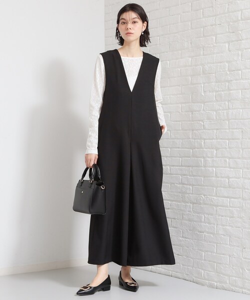 【デザイン】 深いVネックがすっきり映えるオールインワン。 インナー次第で表情を変えられ、ジャケット合わせのきれいめから、カットソー合わせのカジュアルまで幅広く対応。 縦のラインが強調され、全体をシャープに見せます。 【素材】 クリーンに見える生地感で、日常からオフィスシーンまでなじむ表情に。 適度な落ち感でレイヤードしてももたつきにくく、ロングシーズン着回しやすいのも魅力です。 【着こなしポイント】 オフィス: ボウタイブラウスやハイネックインナーで端正に。 休日: ロンTやリブニットでリラックス感をプラス。 きちんと見え: ジャケットやジレを重ね、ヒールやローファーで仕上げて。小ぶりのネックレスでVラインを引き立てると、さらに洗練された印象に。 【仕様】 ・ポケット数:横×2 ・後ろファスナー ・裏地なし ※照明の関係により、実際よりも色味が違って見える場合があります。また、パソコン・スマートフォンなどの環境により、若干製品と画像のカラーが異なる場合もございます。 モデル情報:身長166cm B72 W62 H86 着用サイズ:02(M) 店舗へのお問い合わせ商品番号:040-55001 ●製品寸法: 12(M):着丈131cm B92cm 肩幅39cm H125cm 裾幅46cm 13(L):着丈134cm B95cm 肩幅40cm H128cm 裾幅47cm 備考: