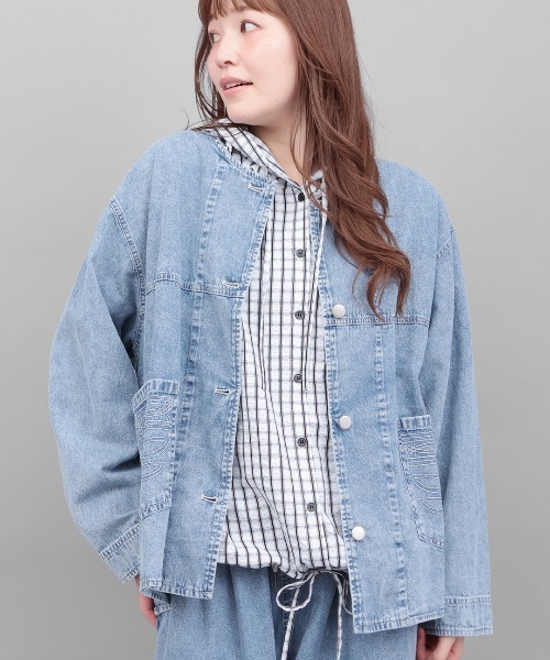 デザインステッチが遊び心のあるライトオンスデニムジャケット ■デザイン ポケットのステッチがアクセントのノーカラーデニムジャケット。6.5ozの柔らかなデニム素材で、ごわつかず快適な着心地です。 ノーカラーで首まわりをすっきり仕上げました◎ たっぷり身幅でゆったり着られるので、重ね着も楽しめます。 ■サイズ感 レディースフリーサイズ 中にスウェットなどを着ても着やすいゆったりサイズ。 ■素材感 軽やかなライトオンスデニムを使用。 柔らかくしなやかな生地感でごわつきにくい。 ■スタイリング 華やかなワンピースの上から羽織って大人っぽいスタイリングに。 同シリーズのパンツと合わせたセットアップコーデもこなれ感が出ておすすめです。 ■カラー ブラック/ライトブルー ■お手入れ洗濯機可/ドライクリーニング --------------------------------- 透け感:透けない 伸縮性:なし 裏地 :なし 光沢 :なし 生地の厚さ:薄手 ポケット:あり --------------------------------- 【お取扱い上のご注意】 ・この製品はインディゴ染料を使用しております。 ・着用中の摩擦により色移りする場合がありますので淡い色の衣類やバッグと一緒に使用しないで下さい。 ・水洗いする際には色落ちする場合がありますので他のものとは別にして洗って下さい。 ・濡れた状態で放置したり、他の物と重ねたりしないで下さい。 ・回転式乾燥機(タンブラー) は型崩れや収縮の恐れがあるためご使用はお避け下さい。 ・蛍光剤、漂白剤入りの洗剤は淡色の色を変化させる恐れがありますのでご使用はお避け下さい。洗い加工を施し独特の風合いを表現している為製品により多少色にばらつきがあります。 ・お洗濯の際には、洗濯ネットを使用してください。 ・直射日光や蛍光灯の長時間照射は、変色の要因になりますのでご注意下さい。 ・アイロンの際には、当て布を使用して下さい。 【TITICACAのお買いものをお楽しみいただくために!】 ▼商品のお気に入り登録 完売カラーの再入荷通知や、ラスト1点の通知、セールの通知も受け取ることができます。 ▼ブランドのお気に入り登録 新商品や再入荷など、いち早くブランドのお得な情報を受けることができます!